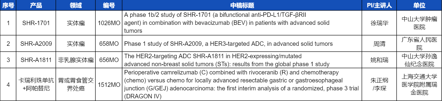在消化系统肿瘤领域,AG庄闲创新产品相关研究共入选1项口头报告和12项壁报展示。除了经典的明星药物卡瑞利珠单抗和阿帕替尼,SHR-A1811、SHR-1701等未上市创新产品也有相应研究入选。此外,阿得贝利单抗、氟唑帕利等已上市药物也在积极探索新的适应症,本次ESMO大会分别有肝内胆管癌和胰腺癌相关研究入选。这些新老药物前沿研究的不断出现,有望为消化系统肿瘤患者带来新的福音!