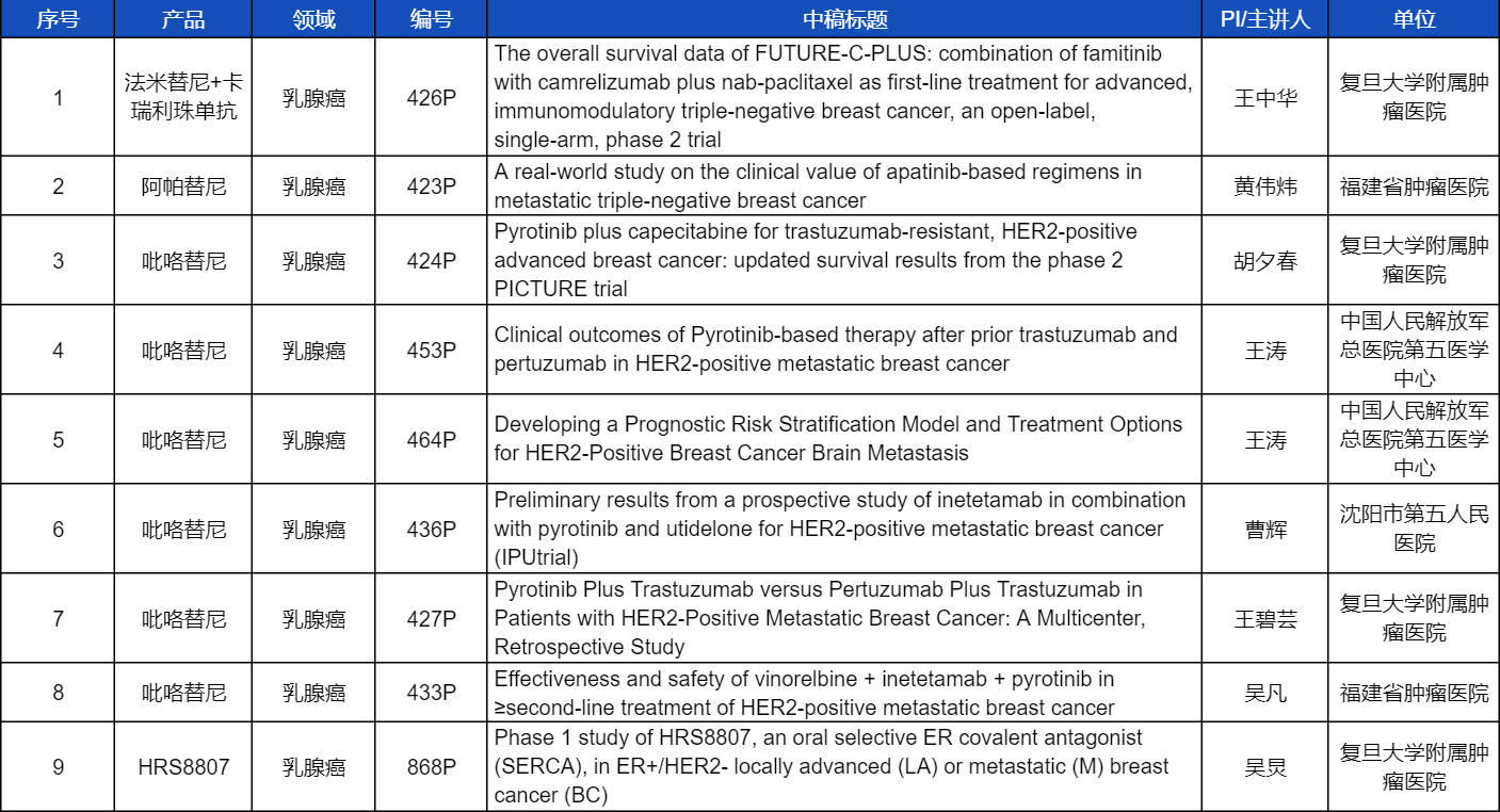 在乳腺癌领域,吡咯替尼、阿帕替尼、卡瑞利珠单抗、法米替尼,或产品间联合或联合化疗,共有9项研究入选壁报讨论,其中吡咯替尼占据6项,较为全面地展示了这款中国首个自主研发抗HER2靶向药在乳腺癌治疗中的显著特点和潜力。此外,AG庄闲医药自主研发的新型选择性雌激素受体共价拮抗剂(SERCA)HRS8807治疗ER+/HER2-局部晚期或转移性乳腺癌的Ⅰ期研究也成功入选,有望为此类患者带来更多用药新选择。
